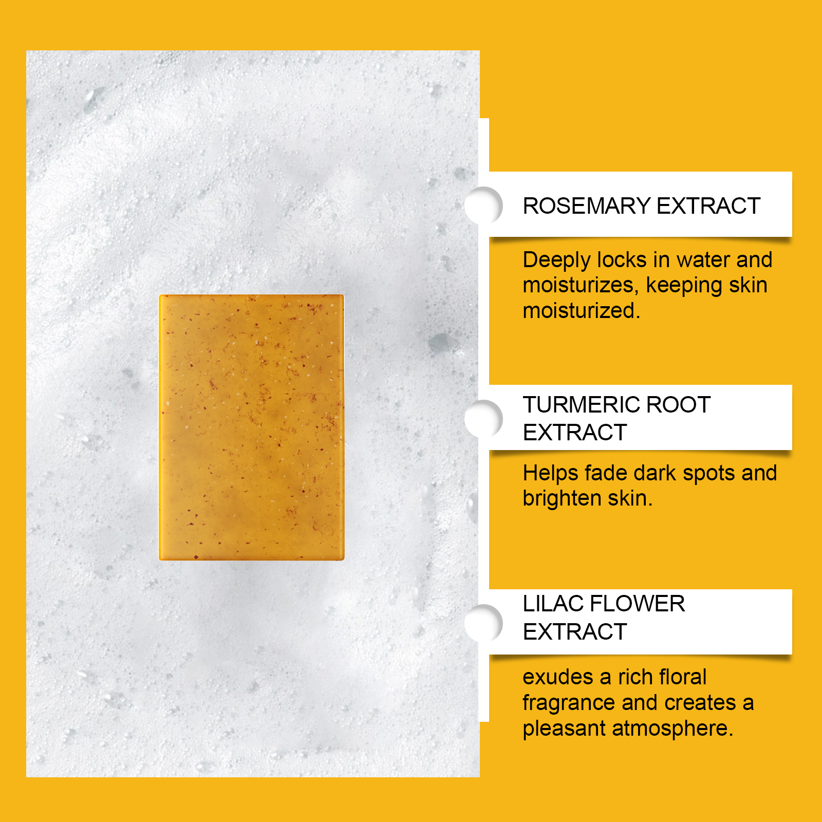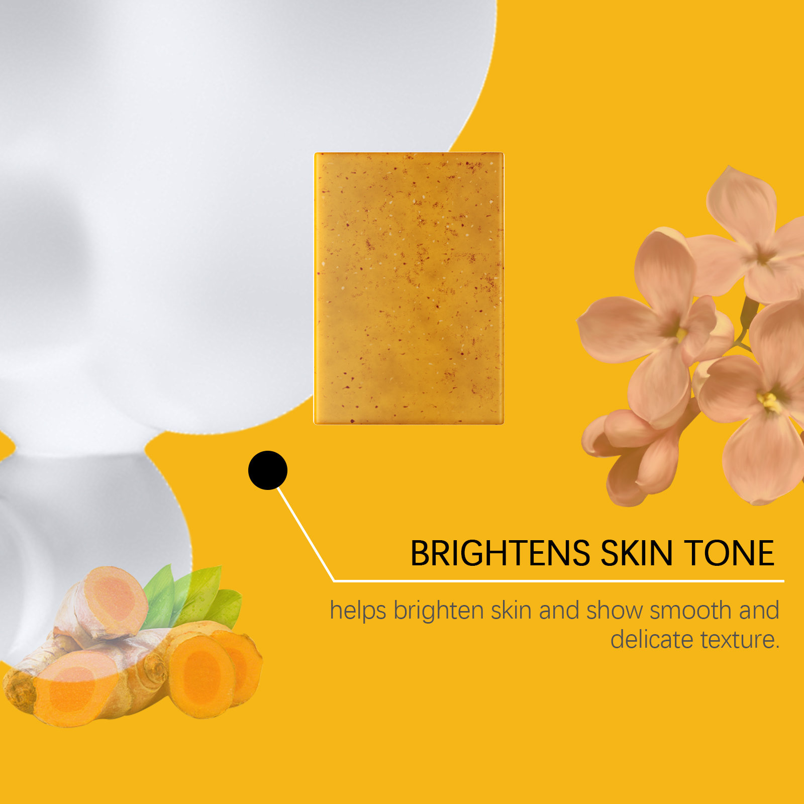 Our turmeric clove essential oil soap contains turmeric root extract, lilac flower extract. It can enrich the foam, remove the surface grease, and keep fresh. Effectively locks in moisture and moisturizes skin, improving skin moisture. The method of applying it is simple: wet the face or body with warm water, lather the soap with the palm of the hand, massage it into the skin in gentle circular motions, and finally, rinse the foam with warm water. And can be gently formulated to help exfoliate and help improve uneven skin tone.